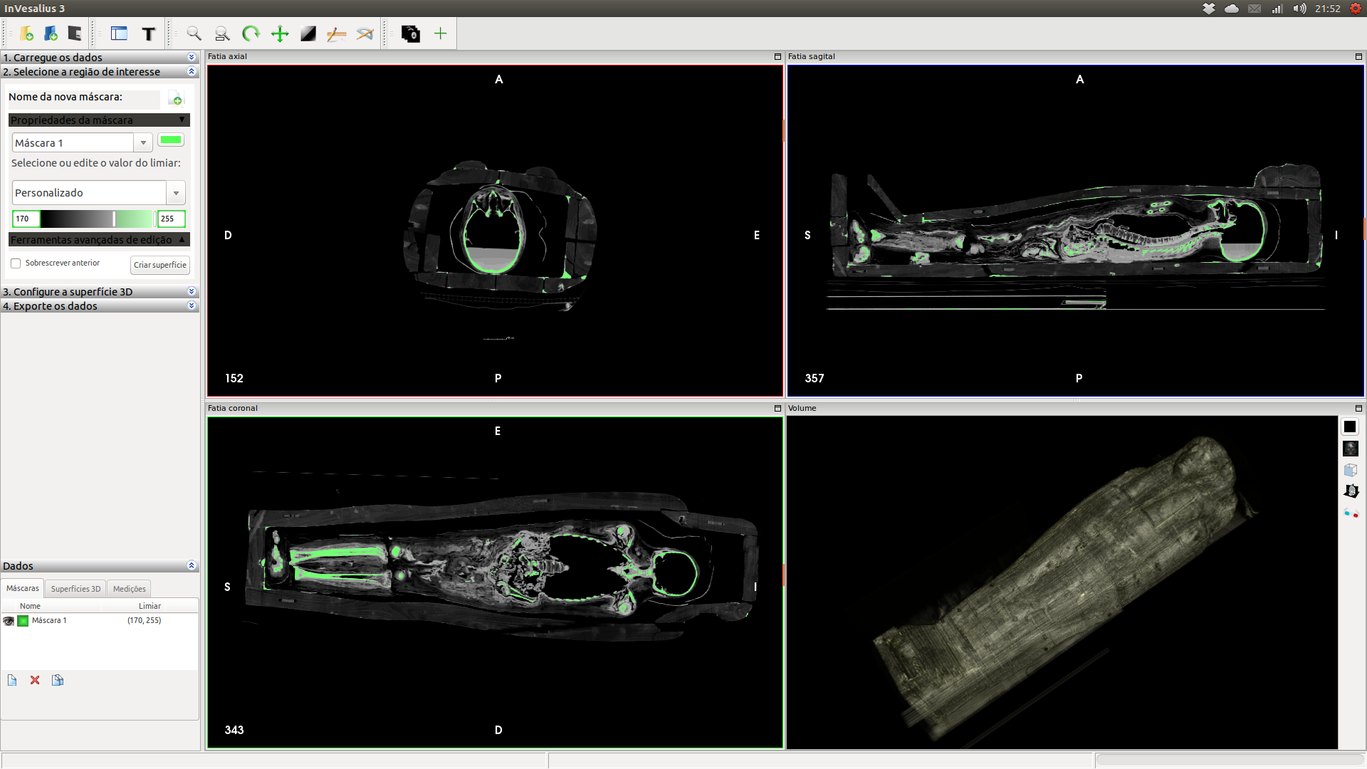 Fiquei bastante entusiasmado quando abri o arquivo no InVesalius e me deparei com aquela múmia completa dentro de um lindo ataúde. Até aquele momento, não imaginava que se tratava de um garoto.