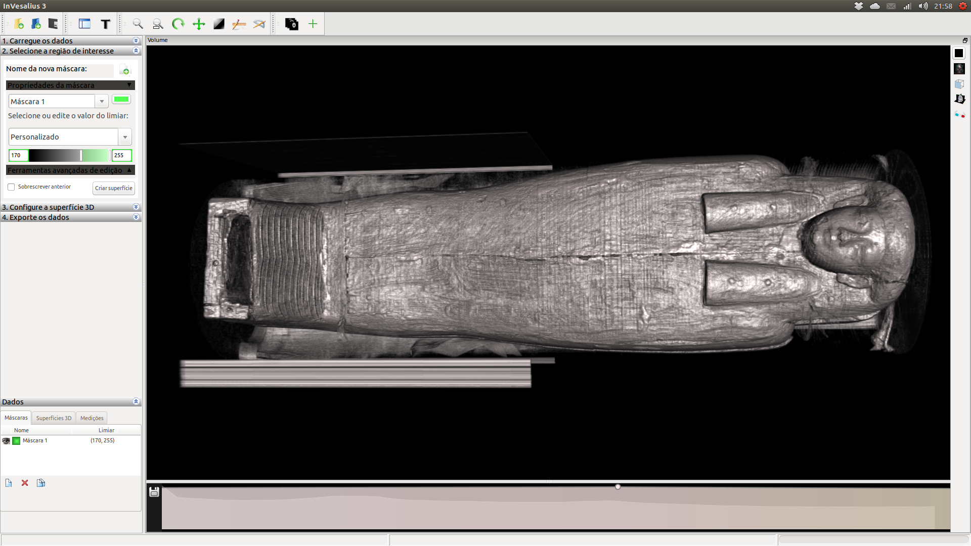 Ao se filtrar os dados no InVesaius, ocultando a faixa correspondente a madeira, eis que o esqueleto lá dentro se revelou em 3 dimensões. As “impurezas” em volta do ataúde ao que parece trata-se do material de vedação entre uma madeira e outra.