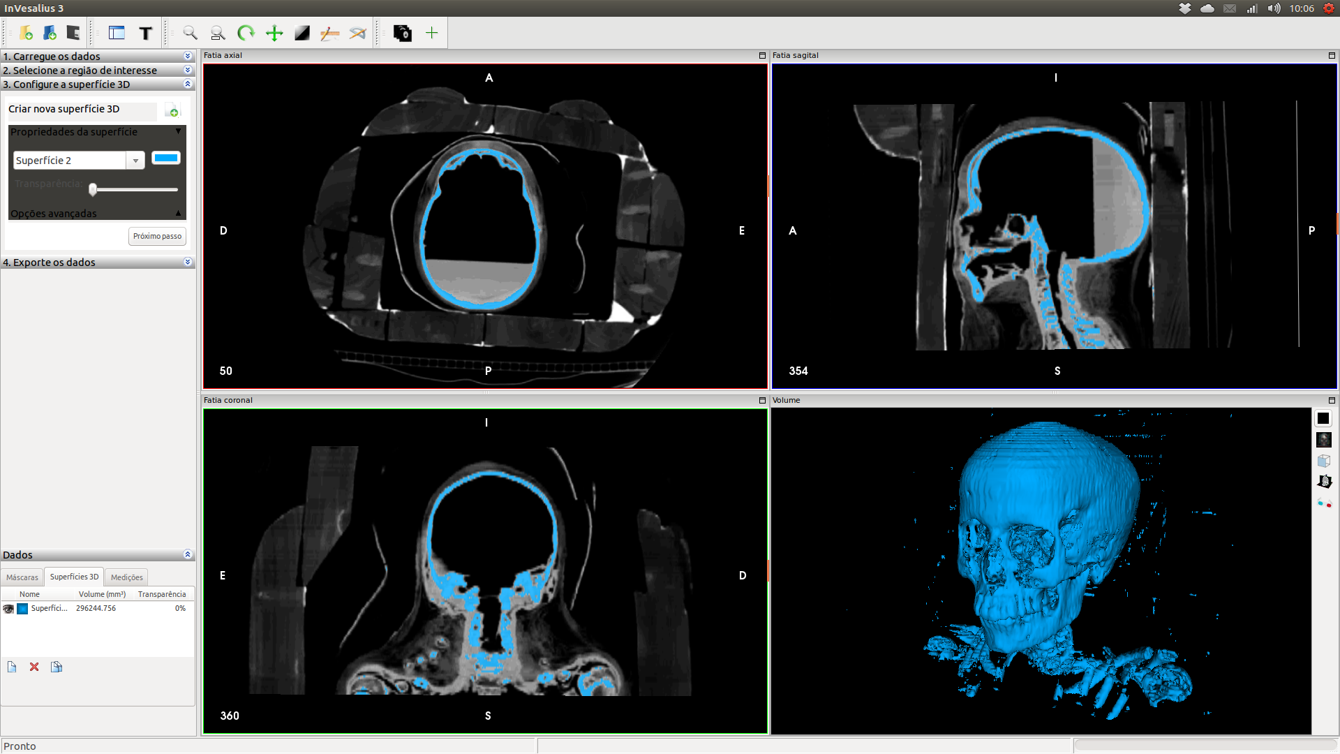 Para estimar a idade, uma das formas mais acessíveis é analisar os dentes. O problema é que filtrar a área dos ossos se tornaria um trabalho infindável, posto que o material de vedação seria exportado juntamente com o crânio. Felizmente o InVesalius conta com uma ferramenta de seleção e exclusão de áreas, que acabou ajudando bastante na filtragem dos ossos, deixando praticamente apenas o crânio para exportação.