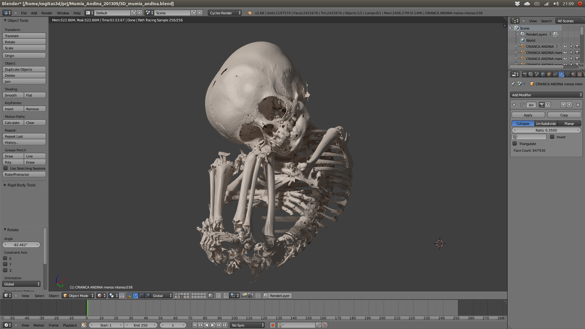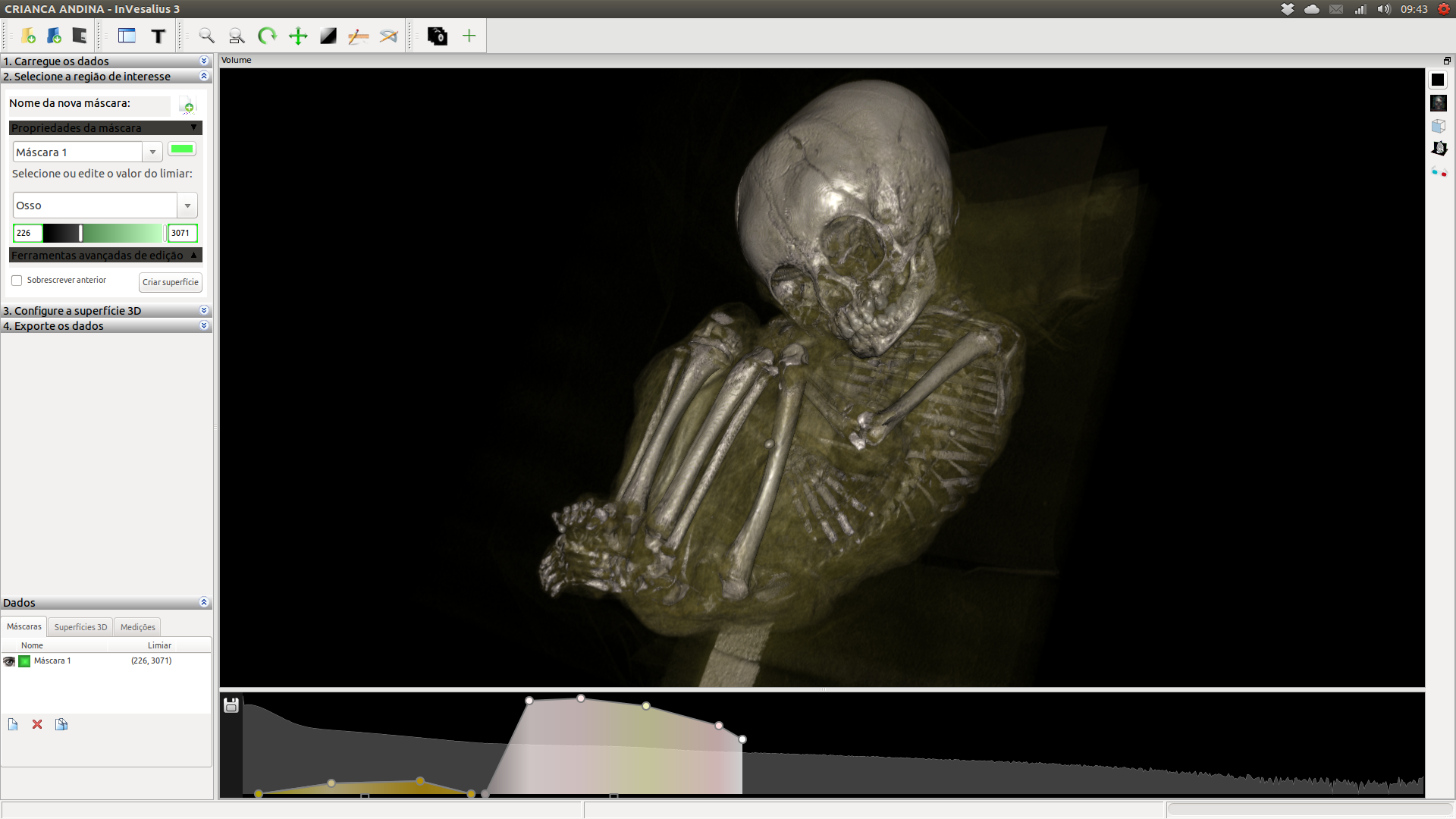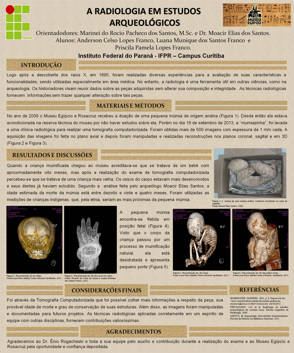 Meses depois, soube que um grupo do IFPR ligado ao curso de Radiologia, estava desenvolvendo um trabalho com a múmia andina. Rapidamente entrei em contato com a profa. Marinei Pacheco e sua aluna Priscila Lopes. Elas acompanharam a tomografia de corpo inteiro da pequena e estavam trabalhando nos dados para que pudessem com eles, dentre outras coisas, chegar à idade da dela quando ela morreu.