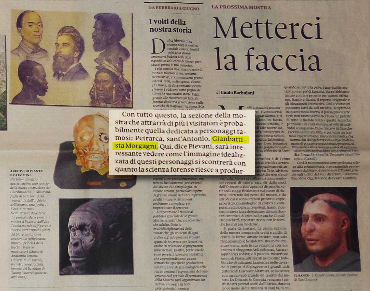 No dia 14 de dezembro foi publicada na sessão de cultura do jornal italiano Il Sole 24 Ore duas páginas falando sobre eventos na Universidade de Pádua. Em uma passagem o Dr. Telmo Pievani, citou Morgagni com uma das faces a serem apresentadas durante uma mostra (FACCE Il Molti Volti Della Storia Umana) que será aberta ao público de fevereiro a junho de 2015.