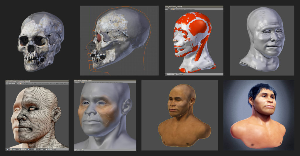 O processo de reconstrução facial correu tranquilamente sem nada de novo em relação aos outros trabalhos. A começar pelo posicionamento dos marcadores de espessura de tecido mole, depois passou pela escultura digital, retopo (simplificação da malha), mapeamento e pigmentação e finalmente a colocação dos cabelos e geração das imagens.