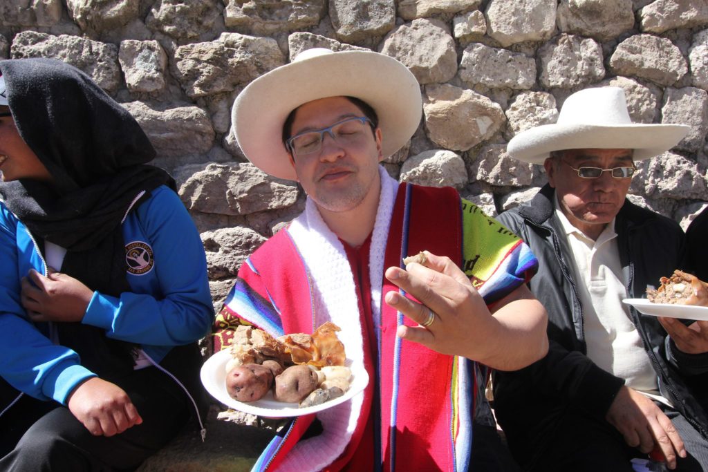 Chegando ao sítio fui tratado quase como um chefe de estado, ao menos foi o que senti. Depois de 4 horas de viagem e naquele lugar de ar limpo e visual maravilhoso, pude avistar que uma delegação já nos esperava na entrada da antiga cidade. Ao descer fui abordado por repórteres, guias e representantes da Municipalidade de Espinar, que me regalaram alguns presentes, dentre eles vistosas indumentárias locais, que abrandaram o frio e aqueceram o coração com tanto calor humano.